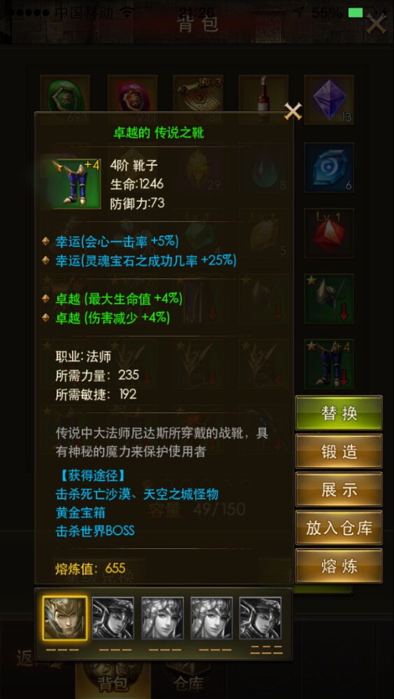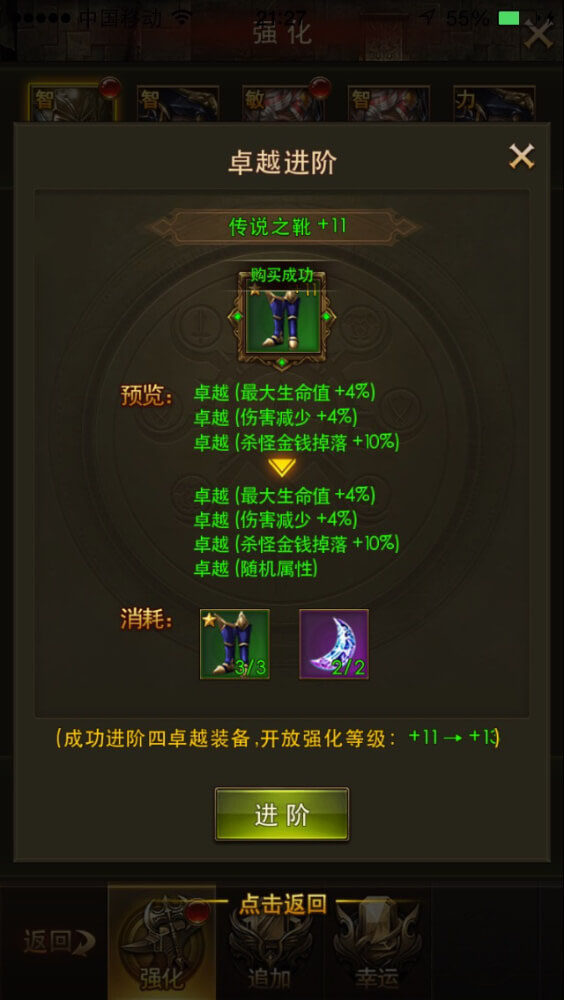 二:中期。当你装备已经+11。+13的时候。当你打倒幸运星级装备时候。你不必为了换不换幸运装备重新进阶、升级而纠结了,只要你在+9 +11 +13进阶的时间放入一样幸运装备 加上月亮石 进阶你就可以获得幸运高级装备了。注意是进阶放。升级放没用.