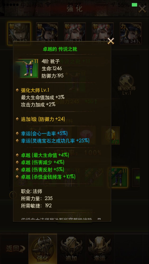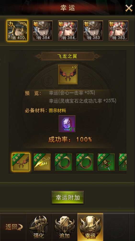 三:后期。当你装备意见满属性了还没有幸运属性的话。你就要使用幸运石来进行强化了!幸运石获得指数五颗星。只有活动的时候才能出