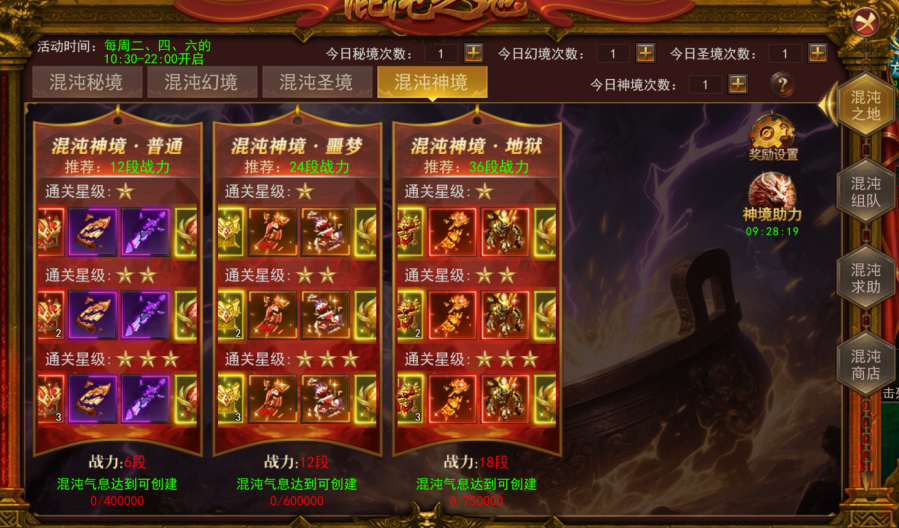 2025-12-04 15:43:35来源:h5.aotian.comHello,各位小伙伴好呀,小编我又又又来了。今天小编就是要讲一讲混沌之地第四个副本-混沌神境。在混沌神境,玩家必须达到6亿的战力,40W的混沌气息才能创建普通副本,噩梦副本要求更难,必须得12亿战力,60W的混沌气息才能创建。地狱更是只有少数人才能满足进入的条件,必须要18亿战力,75W的混沌气息才能创建。