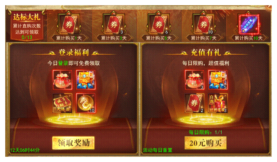 每日登录游戏即可领取福利奖励一份,累计每日限购达标还可获得周年礼卷、活动称号等超值大奖!