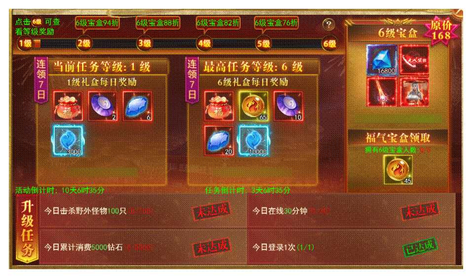 任务阶段达标每日目标升级宝盒,奖励阶段每日领取宝盒奖励,最高可免费升至5级宝盒,直购6级宝盒可领时装大礼!